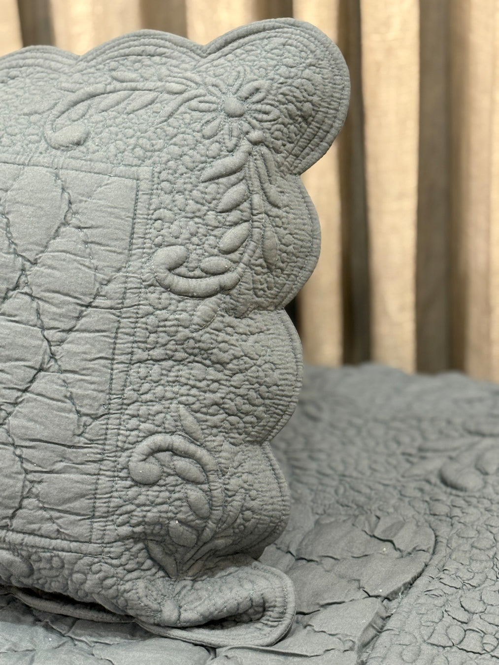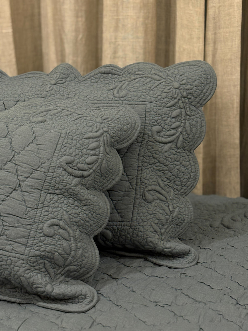 A quiet companion for restful nights, the Meher Quilt brings softness, depth, and a subtle flourish to your bedding. Its surface is delicately detailed with floral trapunto stitching—creating gentle texture without overwhelming the eye. A piece designed to comfort, without fuss.